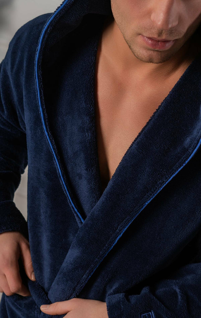A letisztult, férfias köntös szabást a kontrasztos szegélyek a mandzsettán és a galléron teszik még stílusosabbá. 120 cm-es hossza teljes fedést nyújt, így ideális választás otthoni pihenéshez, wellnesshez vagy szállodai használatra is.