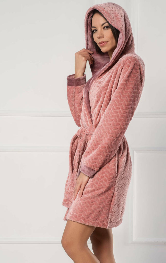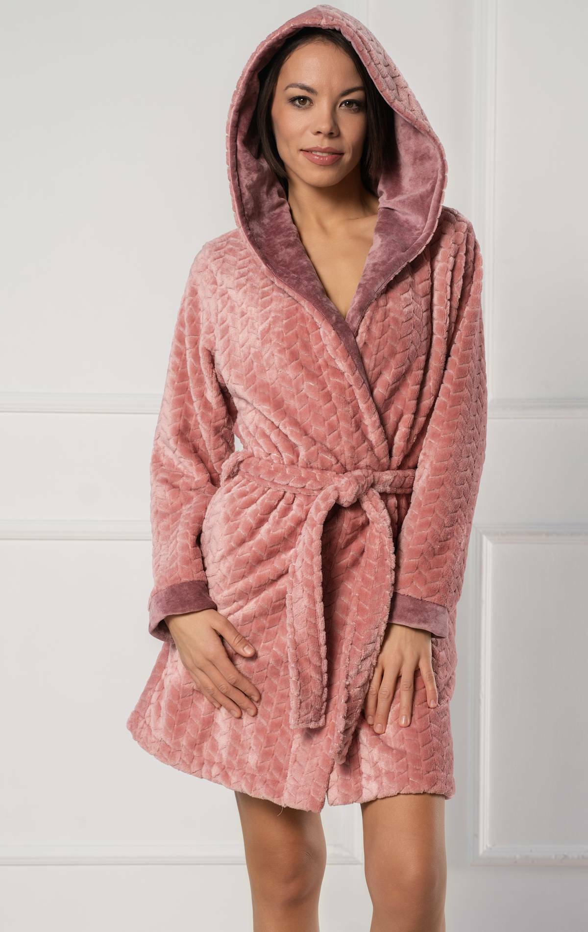 A loveland kollekció rövid köntöse egy játékosan elegáns, mégis kifinomult köntös, ultrapuha, mintás wellsoft anyagból, fényes nicky velúr díszítésekkel. A kontrasztos anyag megjelenik a mandzsettákon és a kapucni belsejében, visszafogott, mégis elegáns vizuális részletet teremtve. Rövid fazonja és kényelmes kapucnija modern, otthoni vagy wellness viseletek tökéletes darabjává teszi.